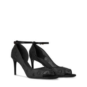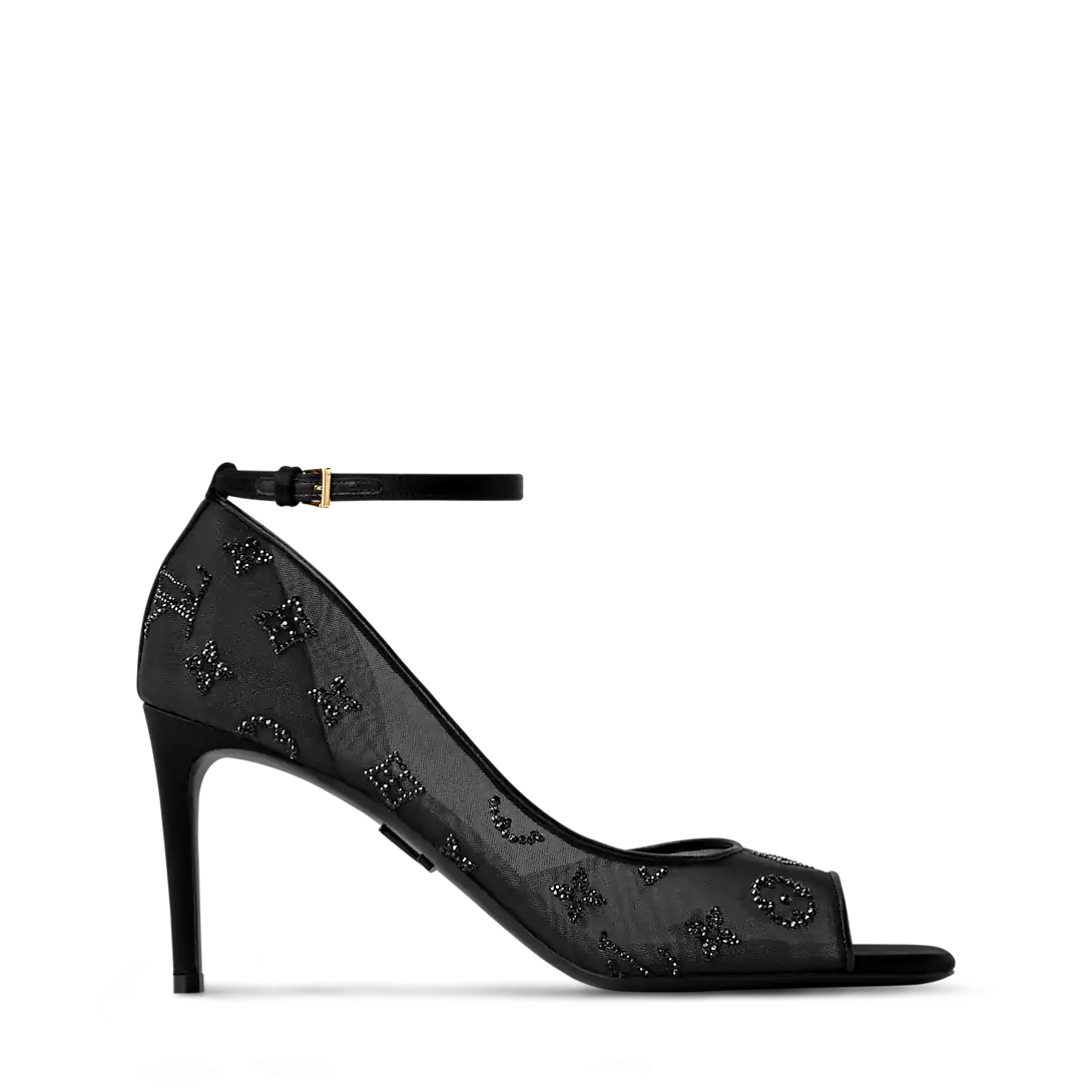 This elegant Gala sandal is crafted from semi-translucent mesh, punctuated with expertly embroidered rhinestones to create the iconic Monogram motif. The upper features a slim ankle strap that contrasts with a high stiletto heel. This shoe sits on a leather outsole, enhanced by a gold-tone LV Initials accessory.