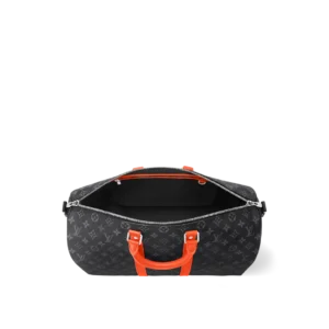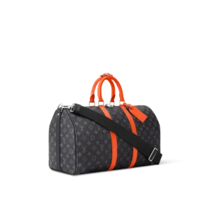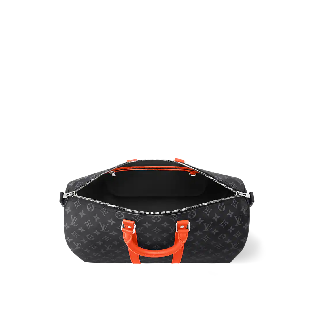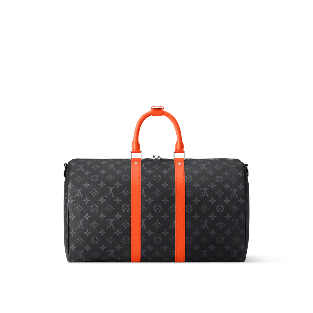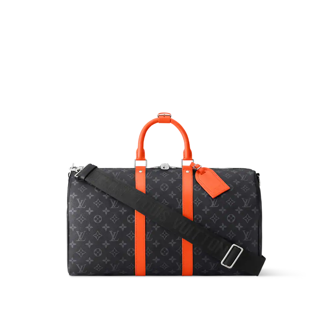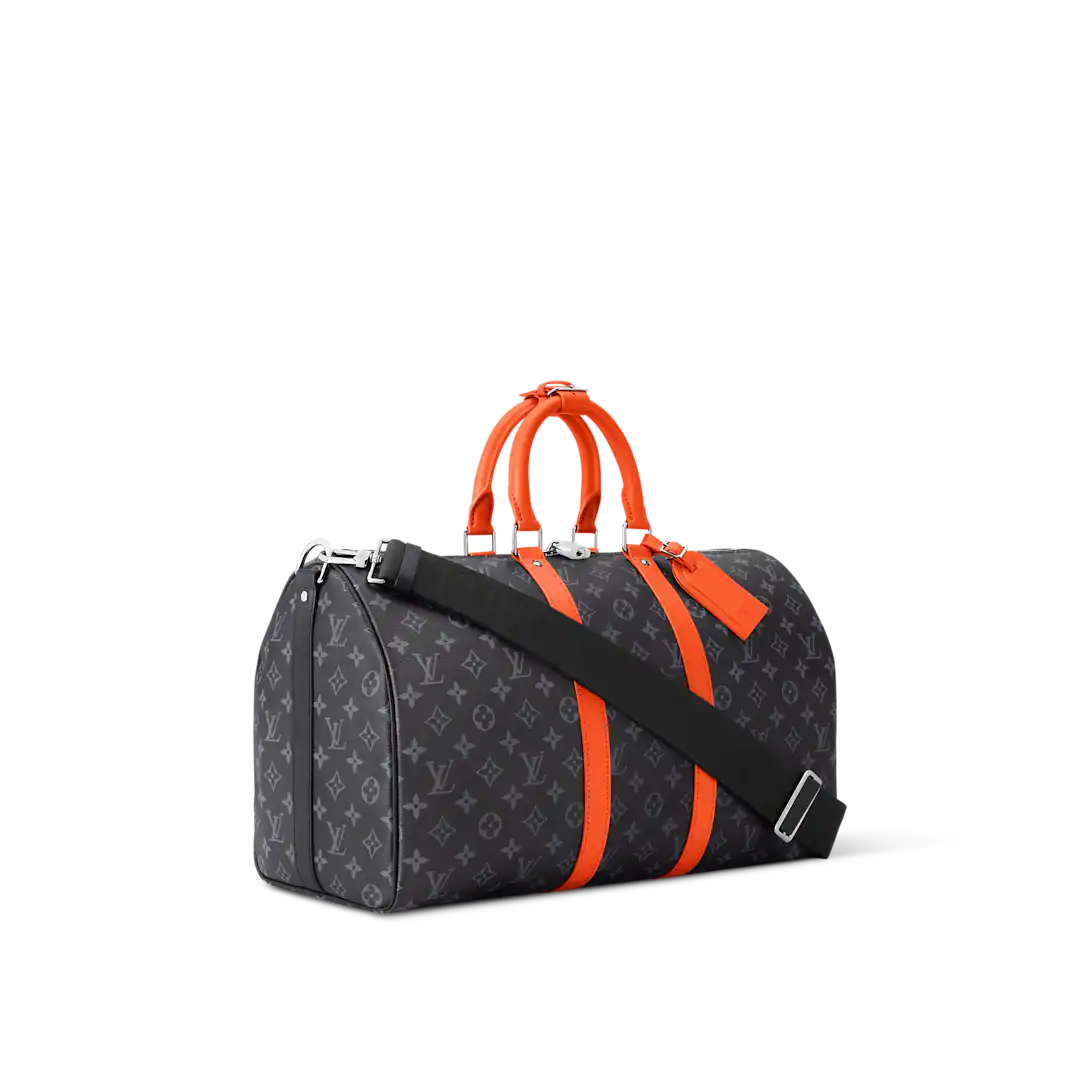 This Keepall Bandoulière 45 bag in Monogram Éclipse canvas is accented with side bands, top handles, and brightly colored leather trim. This cabin-sized model, lined with black textile, features an interior zippered pocket. The wide, adjustable and removable shoulder strap and top handles offer multiple carrying options.