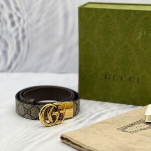(LIKE NEW) GUCCI MARMONT REVERSIBLE BELT SIZE 80/32 IN BEIGE GG SUPREME CANVAS AND DARK BROWN CALFSKIN LEATHER -FULL SET-